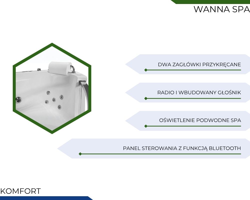 Wbudowany podgrzewacz o mocy 1,5 kW pomaga utrzymać temperaturę wody podczas dłuższej kąpieli. Dzięki temu hydromasaż może trwać znacznie dłużej bez konieczności dolewania gorącej wody. Rozwiązanie to zwiększa komfort użytkowania oraz pozwala w pełni korzystać z funkcji relaksacyjnych wanny. Stała temperatura wody sprawia, że kąpiel staje się jeszcze przyjemniejsza, a sama wanna dostępna jest w atrakcyjnej cenie wraz z podgrzewaczem, co czyni ją wyjątkowo korzystnym wyborem.