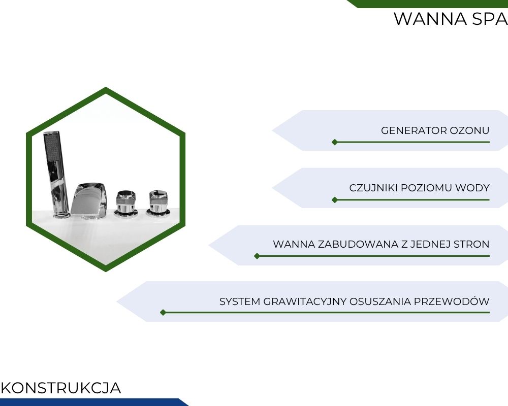 Wbudowany generator ozonu wspiera utrzymanie higieny instalacji hydromasażu. Ozon pomaga ograniczyć rozwój bakterii oraz nieprzyjemnych zapachów w systemie wodnym. Dzięki temu wnętrze przewodów pozostaje czystsze przez dłuższy czas. Rozwiązanie to poprawia komfort i bezpieczeństwo użytkowania.