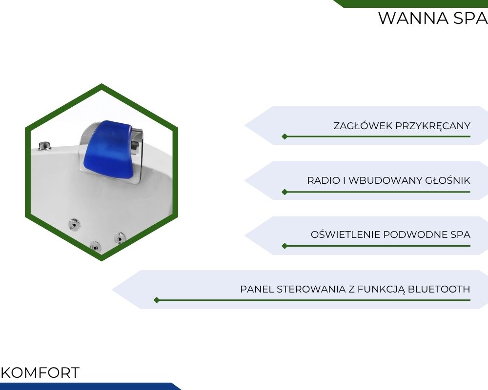 Wanna posiada wbudowane radio oraz głośnik, które pozwalają stworzyć przyjemną atmosferę podczas kąpieli. Użytkownik może słuchać muzyki, audycji radiowych lub relaksacyjnych dźwięków. System audio zwiększa komfort korzystania z wanny i zamienia kąpiel w prawdziwy rytuał relaksu.