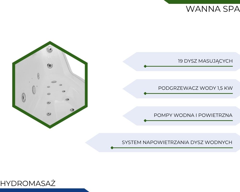 Wanna została wyposażona w rozbudowany system 19 dysz, które zapewniają intensywny i równomierny masaż całego ciała. W skład systemu wchodzą 5 dużych dysz wodnych 3,5″ i 4 sztuki 2″ oraz 10 dysz powietrznych 1″. Takie połączenie pozwala uzyskać zarówno głęboki masaż wodny pleców i bioder, jak i subtelny masaż bąbelkowy całego ciała. Dzięki temu kąpiel staje się prawdziwą formą regeneracji i odprężenia.