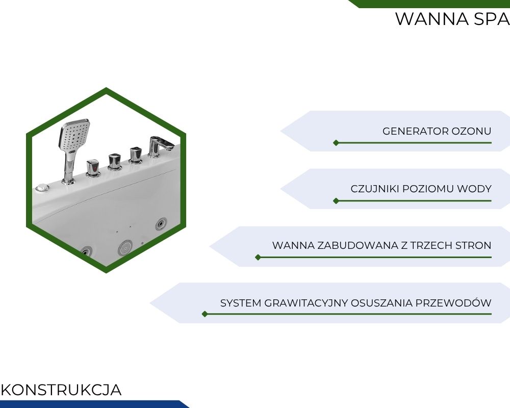Wbudowany generator ozonu wspiera utrzymanie higieny instalacji hydromasażu. Ozon pomaga ograniczyć rozwój bakterii oraz nieprzyjemnych zapachów w systemie wodnym. Dzięki temu wnętrze przewodów pozostaje czystsze przez dłuższy czas. Rozwiązanie to poprawia komfort i bezpieczeństwo użytkowania.