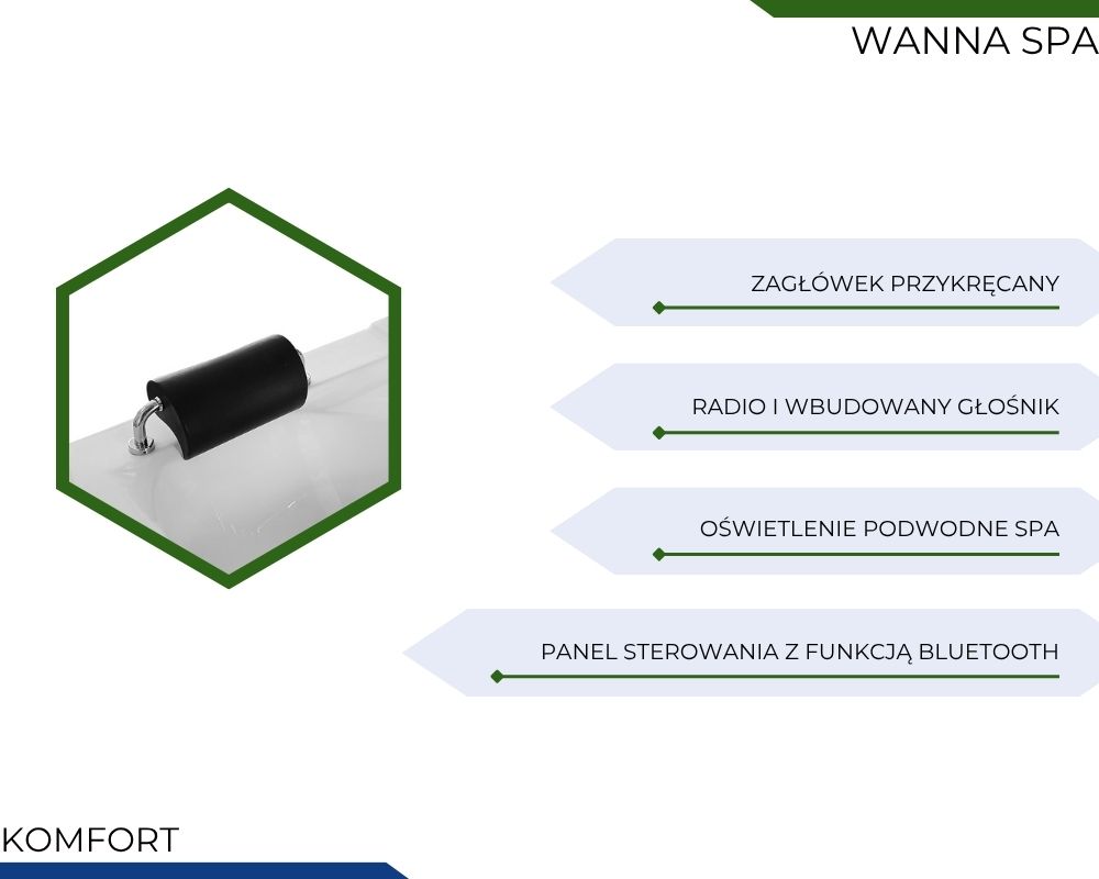 Wanna posiada wbudowane radio oraz głośnik, które pozwalają stworzyć przyjemną atmosferę podczas kąpieli. Użytkownik może słuchać muzyki, audycji radiowych lub relaksacyjnych dźwięków. System audio zwiększa komfort korzystania z wanny i zamienia kąpiel w prawdziwy rytuał relaksu.