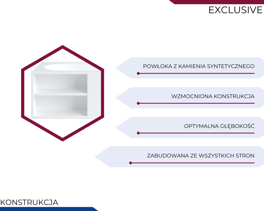 Gładka, nieporowata powierzchnia z wysokiej jakości kamienia syntetycznego skutecznie ogranicza osadzanie się zabrudzeń, kamienia i bakterii, zachowując idealną czystość na dłużej. Brak porów sprawia, że czyszczenie staje się szybkie, łatwe i nie wymaga silnych detergentów. To doskonały wybór dla osób ceniących higienę, świeżość i estetykę w swojej łazience.