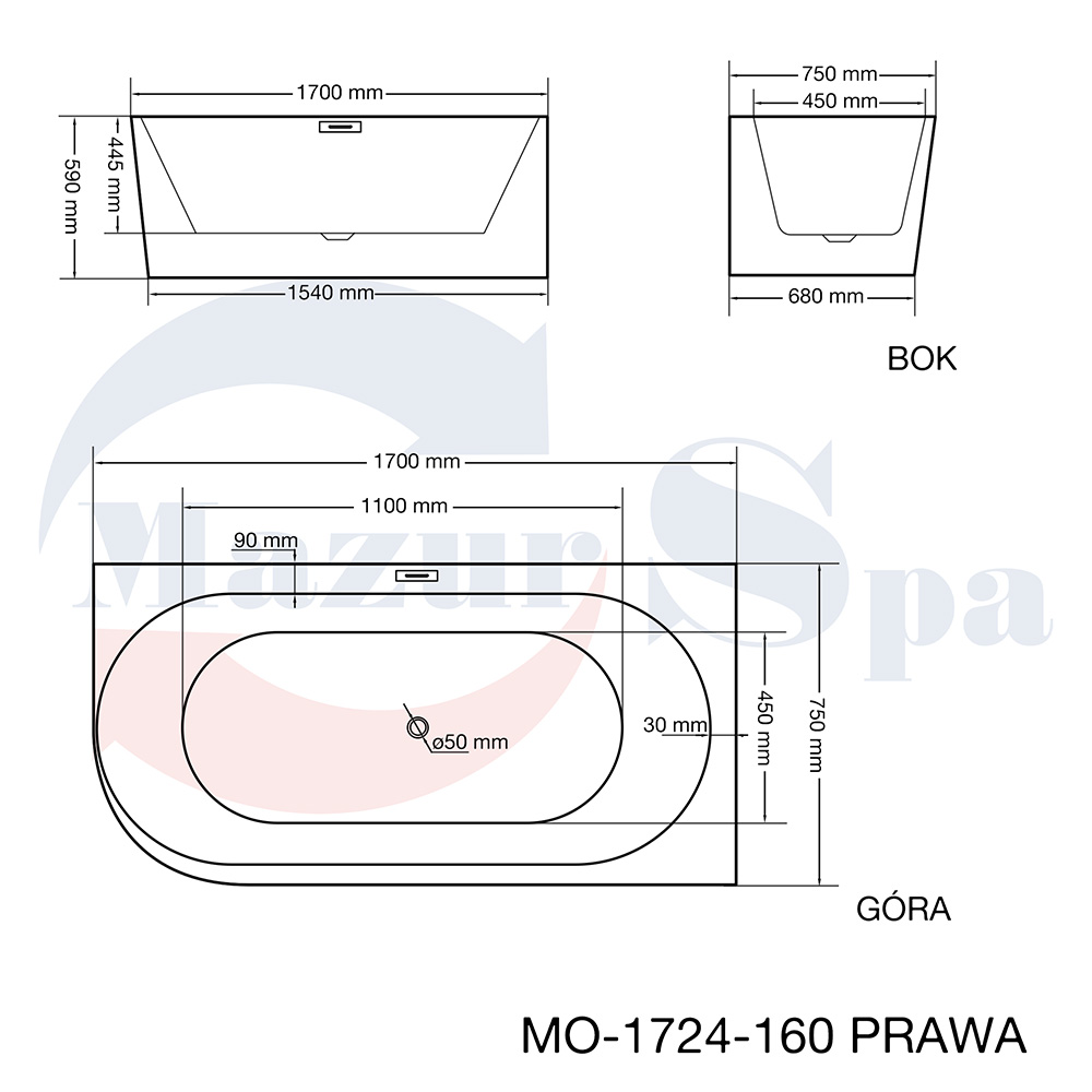 MO-1724-160 PRAWA Wanna wolnostojąca przyścienna 160X75X59CM