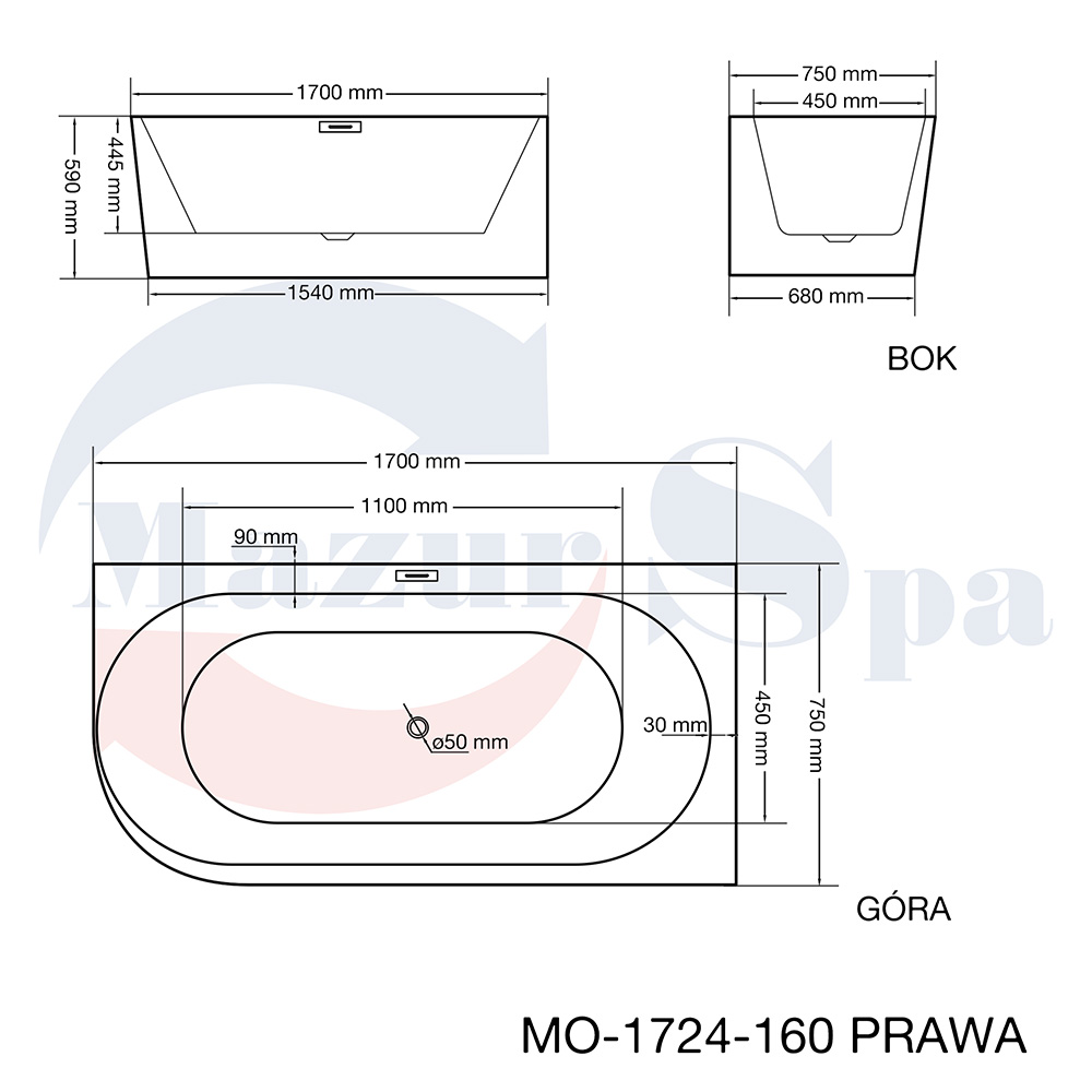 MO-1724-160 PRAWA Wanna wolnostojąca przyścienna 160X75X59CM
