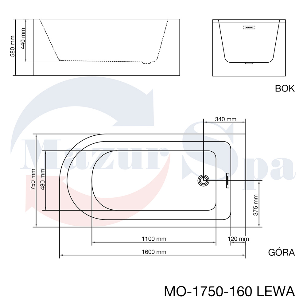 MO-1750-160 LEWA Wanna wolnostojąca przyścienna 160X75X58CM