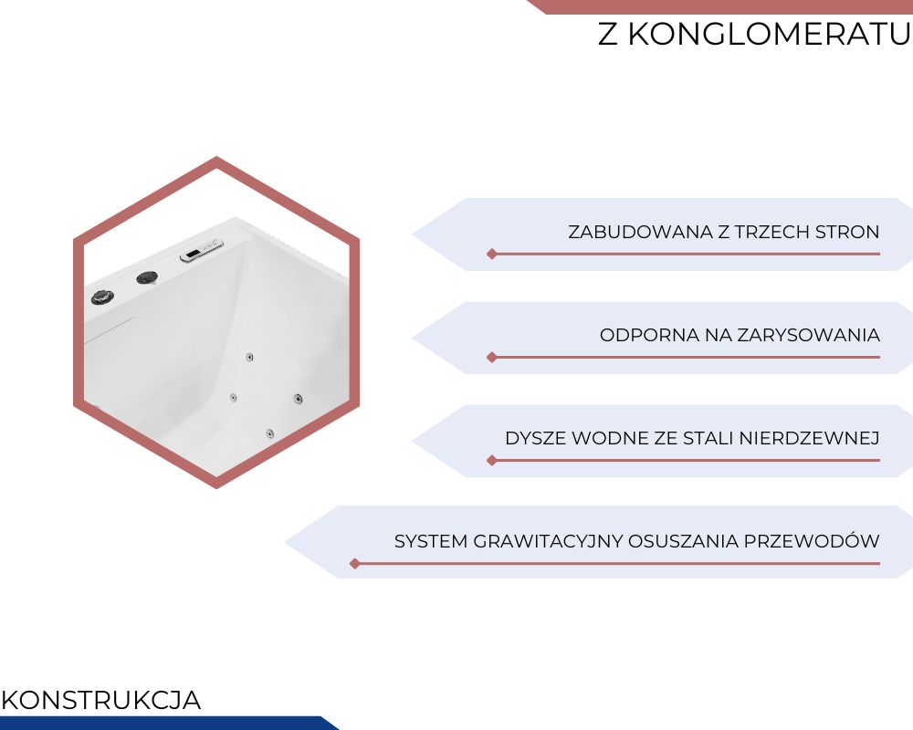 Wanny z konglomeratu to synonim elegancji, trwałości i komfortu. Wyróżniają się nowoczesnym designem, gładką, satynową powierzchnią i wyjątkowymi właściwościami użytkowymi. Dzięki połączeniu kamienia naturalnego i żywicy są niezwykle odporne na zarysowania, a ich twarda struktura doskonale sprawdza się nawet w intensywnie użytkowanych łazienkach. Świetna izolacja cieplna sprawia, że woda długo utrzymuje przyjemną temperaturę, a gładka, nieporowata powierzchnia ułatwia czyszczenie i zapewnia higienę. Wanny te łączą estetykę z funkcjonalnością, tworząc domową strefę relaksu, w której każdy detal został dopracowany z myślą o komforcie i trwałości.