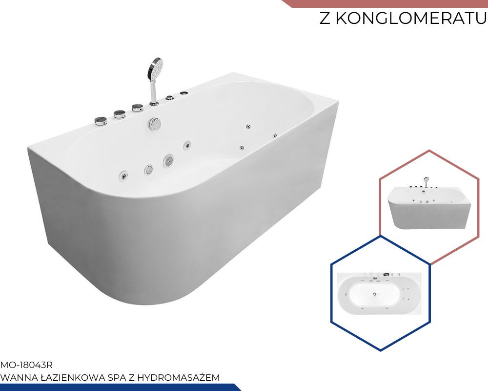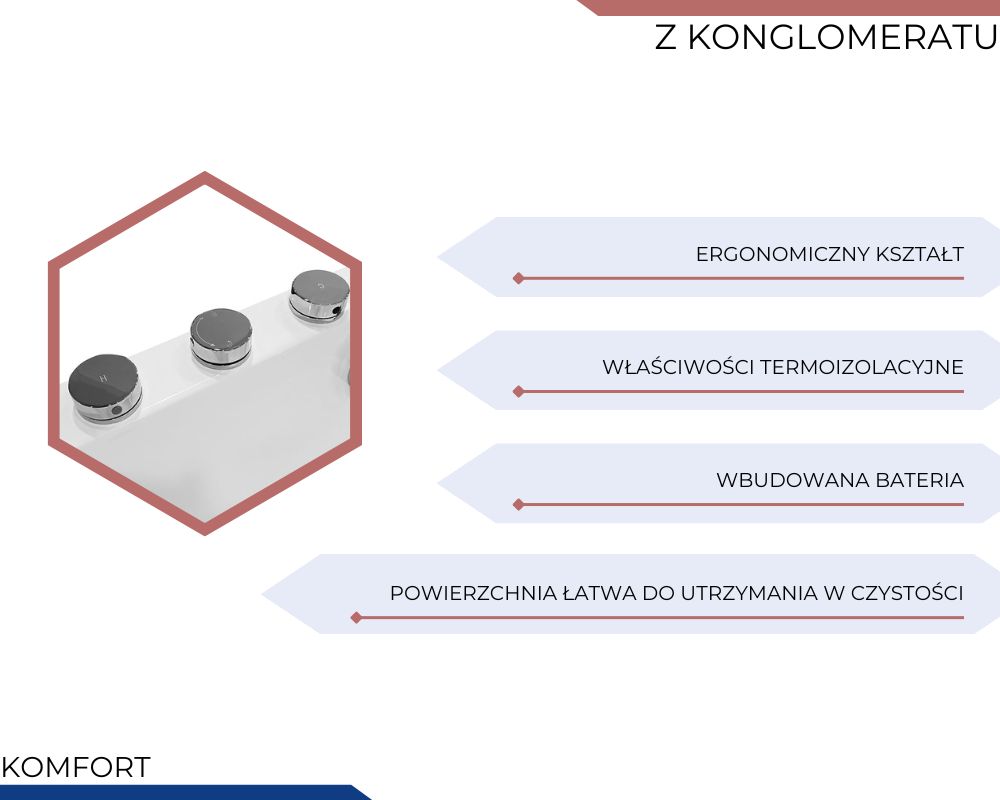 Wanny z konglomeratu to połączenie elegancji, trwałości i komfortu. Wyróżniają się gładką, satynową powierzchnią i minimalistycznym designem, który doskonale pasuje do nowoczesnych aranżacji. Konglomerat zapewnia wyjątkową odporność na uszkodzenia i utrzymuje ciepło wody przez długi czas, gwarantując relaks i wygodę. Gładka, nieporowata struktura ułatwia czyszczenie i pozwala zachować idealny wygląd przez lata.