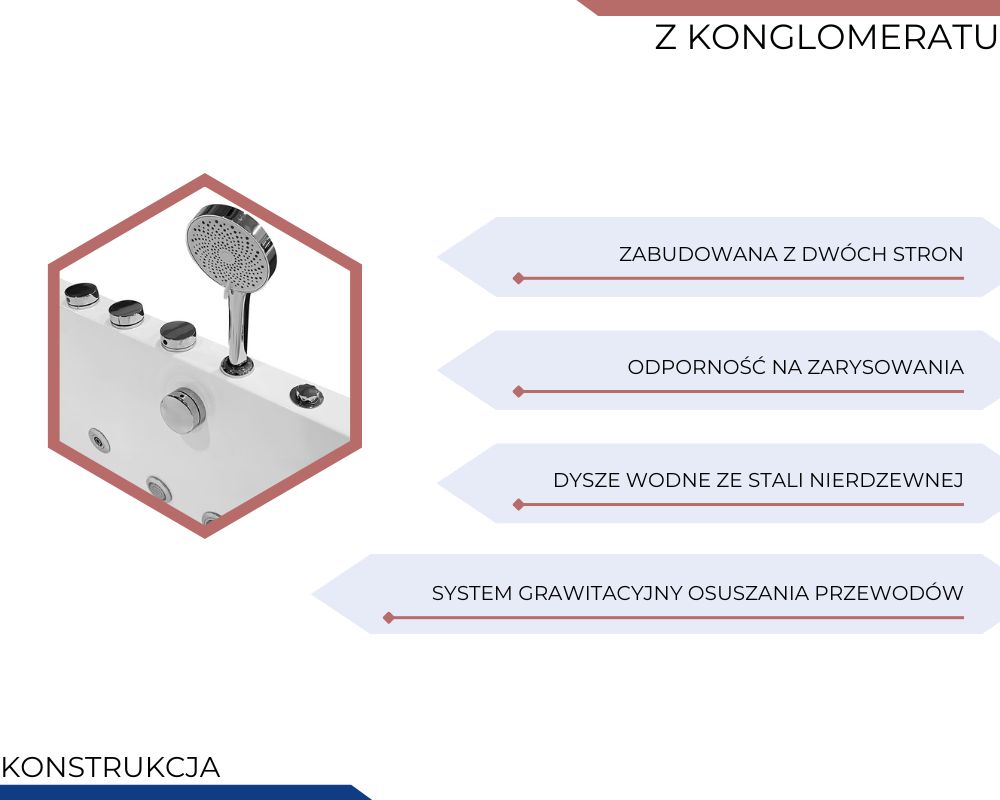 Wanny z konglomeratu to synonim elegancji, trwałości i komfortu. Wyróżniają się nowoczesnym designem, gładką, satynową powierzchnią i wyjątkowymi właściwościami użytkowymi. Dzięki połączeniu kamienia naturalnego i żywicy są niezwykle odporne na zarysowania, a ich twarda struktura doskonale sprawdza się nawet w intensywnie użytkowanych łazienkach. Świetna izolacja cieplna sprawia, że woda długo utrzymuje przyjemną temperaturę, a gładka, nieporowata powierzchnia ułatwia czyszczenie i zapewnia higienę. Wanny te łączą estetykę z funkcjonalnością, tworząc domową strefę relaksu, w której każdy detal został dopracowany z myślą o komforcie i trwałości.