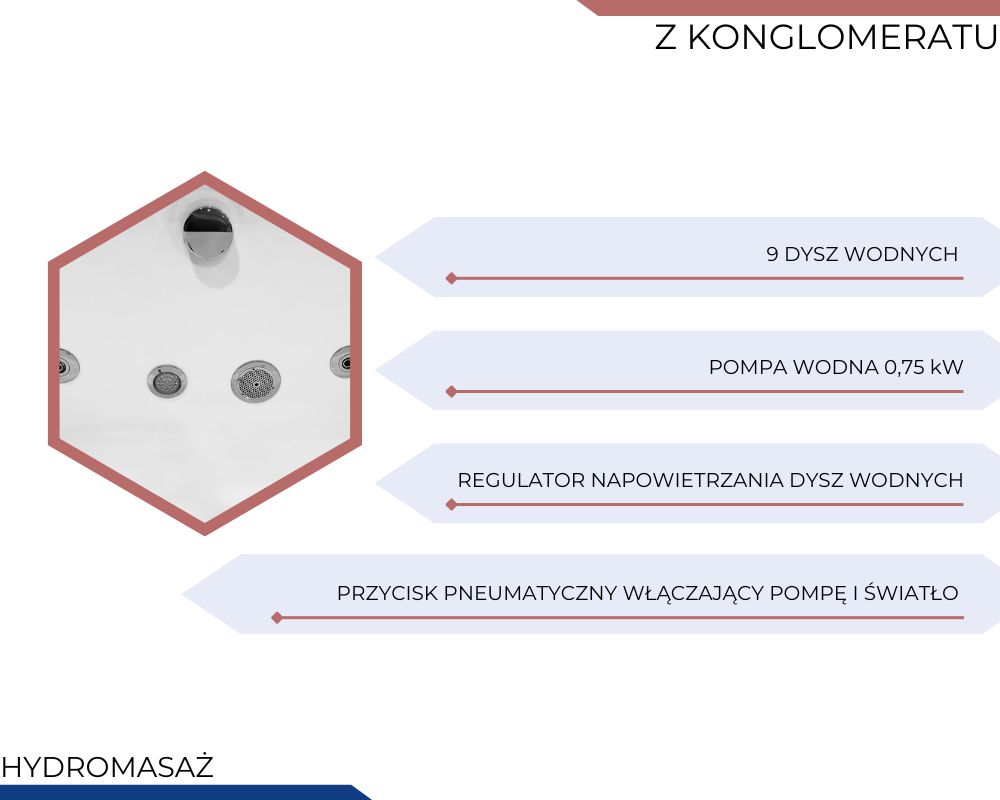 Wanna posiada 9 dysz wodnych, które zapewniają intensywny i kompleksowy hydromasaż całego ciała. Odpowiednio rozmieszczone dysze generują mocne, ale jednocześnie relaksujące strumienie wody, działające na kluczowe partie mięśni. Taki masaż pomaga rozluźnić napięcie, poprawia krążenie i wspomaga regenerację organizmu, zamieniając każdą kąpiel w prawdziwy rytuał odprężenia.
