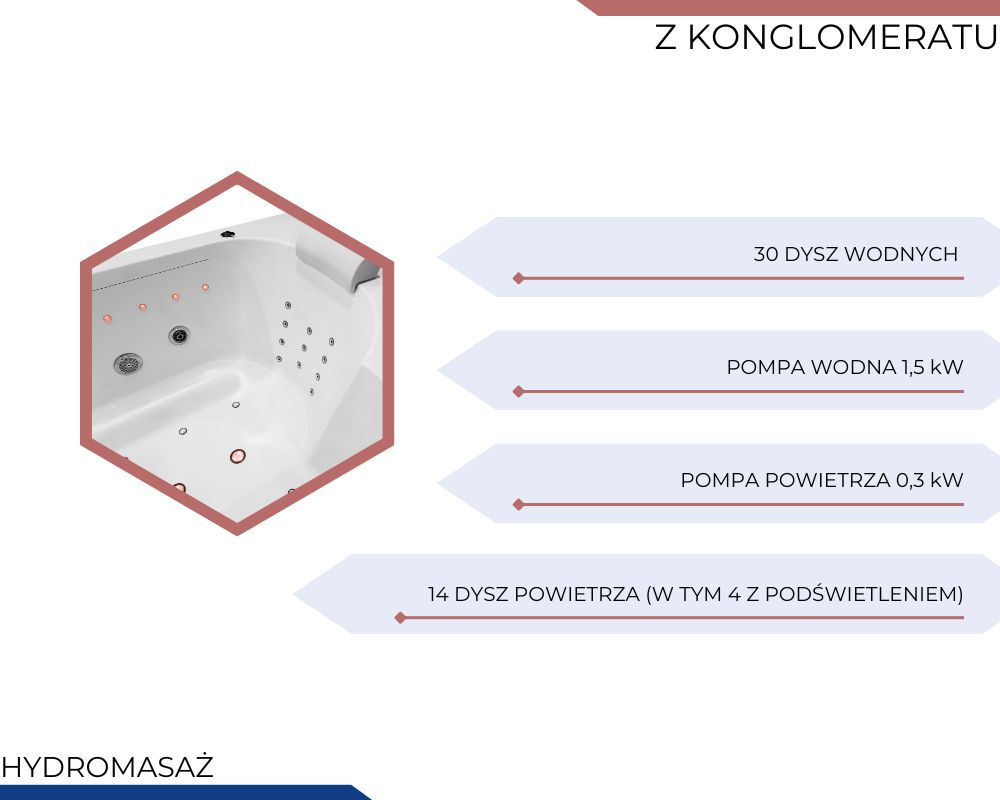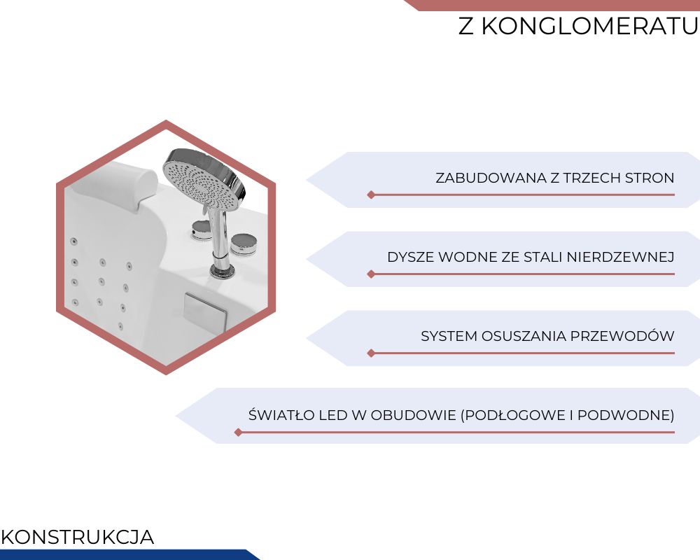 Wanna posiada 30 dysz wodnych, które zapewniają intensywny i kompleksowy hydromasaż całego ciała. Odpowiednio rozmieszczone dysze generują mocne, ale jednocześnie relaksujące strumienie wody, działające na kluczowe partie mięśni. Taki masaż pomaga rozluźnić napięcie, poprawia krążenie i wspomaga regenerację organizmu, zamieniając każdą kąpiel w prawdziwy rytuał odprężenia.
