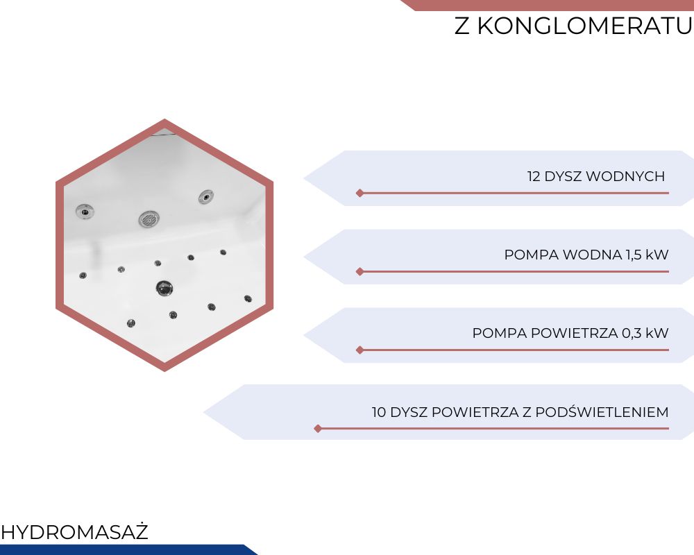 Wanna posiada również pompę powietrza o mocy 0,3 kW, która odpowiada za efektywne działanie systemu masażu powietrznego. Generuje delikatne, równomierne strumienie bąbelków, tworząc przyjemny efekt relaksacyjny i lekkości. Cicha i wydajna praca pompy gwarantuje pełen komfort podczas kąpieli, a jej niezawodność przekłada się na długą żywotność całego systemu.