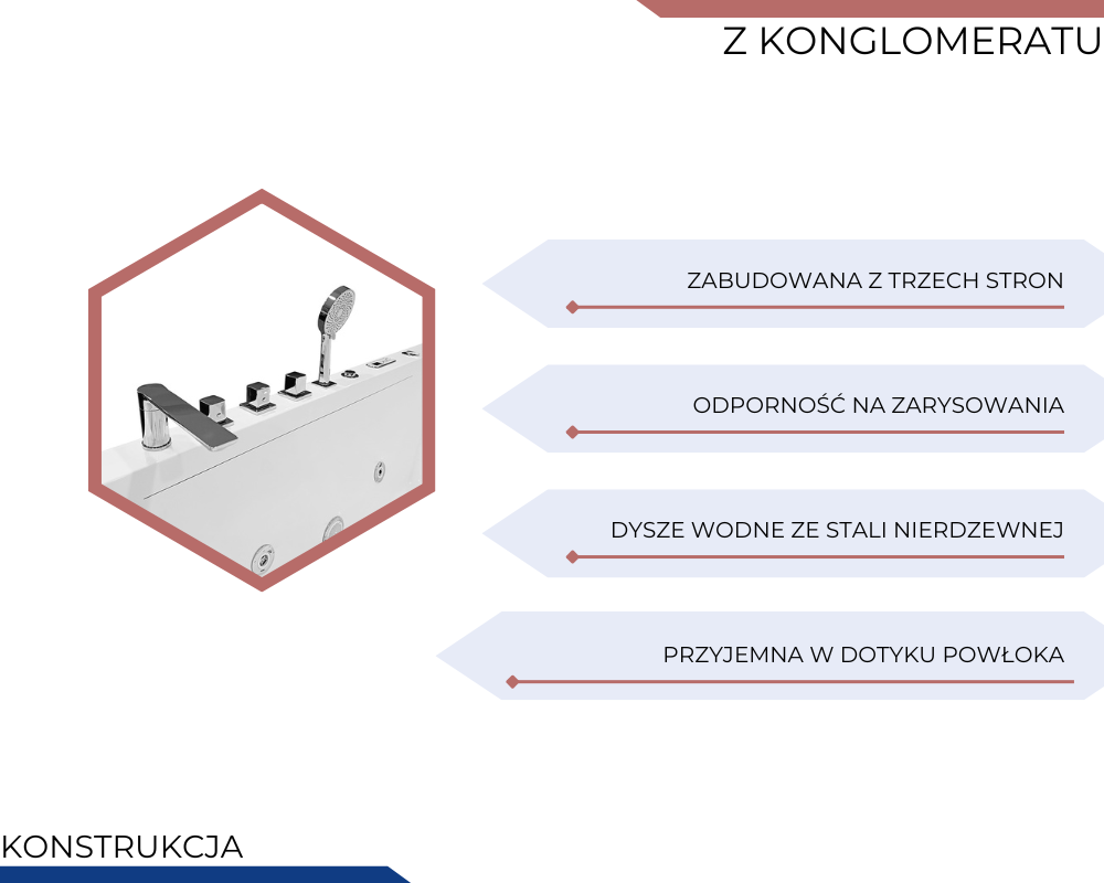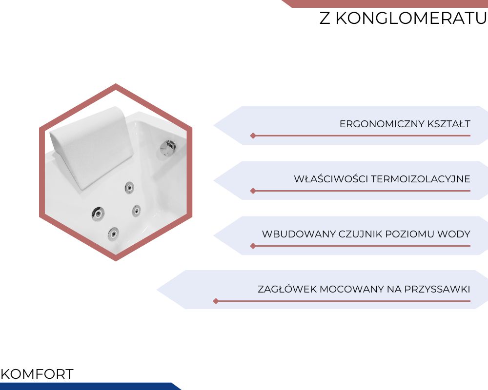 Wanny z konglomeratu to synonim elegancji, trwałości i komfortu. Wyróżniają się nowoczesnym designem, gładką, satynową powierzchnią i wyjątkowymi właściwościami użytkowymi. Dzięki połączeniu kamienia naturalnego i żywicy są niezwykle odporne na zarysowania, a ich twarda struktura doskonale sprawdza się nawet w intensywnie użytkowanych łazienkach. Świetna izolacja cieplna sprawia, że woda długo utrzymuje przyjemną temperaturę, a gładka, nieporowata powierzchnia ułatwia czyszczenie i zapewnia higienę. Wanny te łączą estetykę z funkcjonalnością, tworząc domową strefę relaksu, w której każdy detal został dopracowany z myślą o komforcie i trwałości.