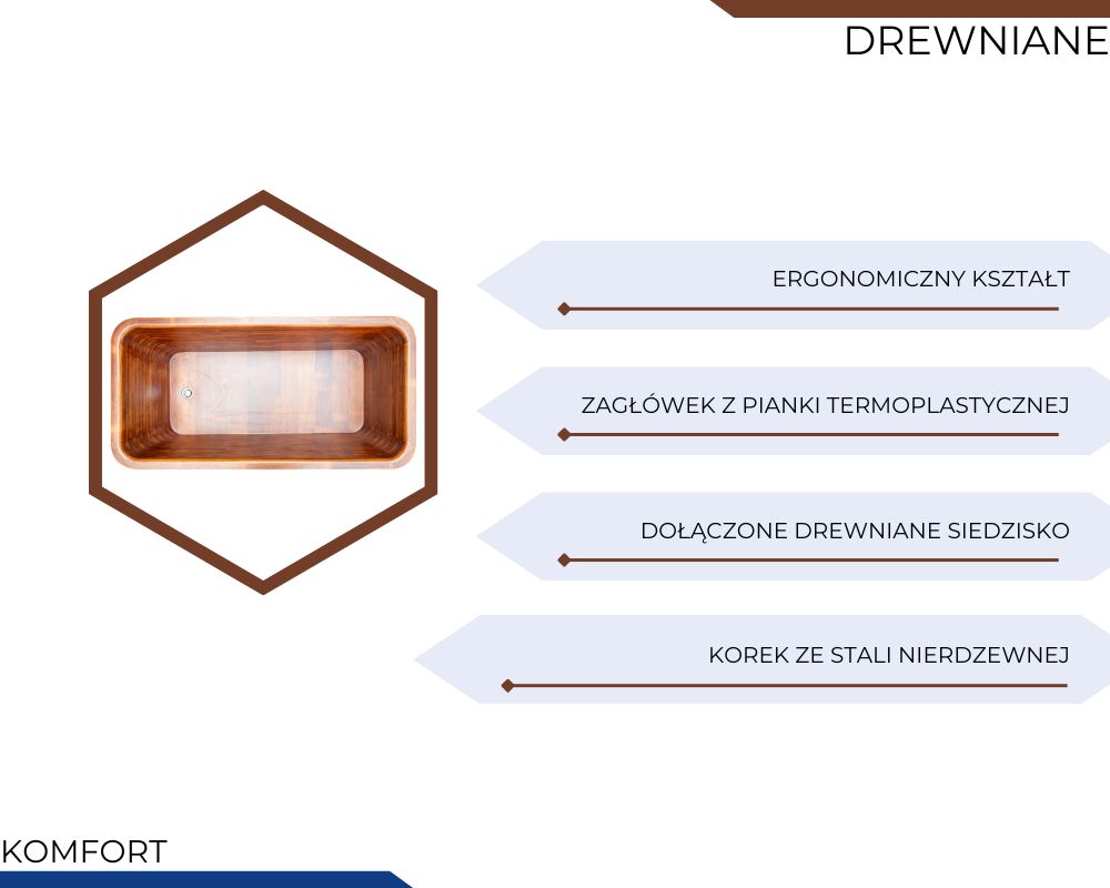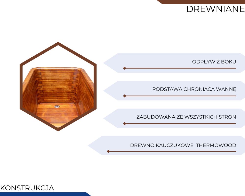 Wanna wolnostojąca o nowoczesnym, prostokątnym kształcie zapewnia komfort podczas siedzącej lub półleżącej kąpieli. Wykonana z trwałego drewna kauczukowego (rubber wood) poddanego obróbce ThermoWood, cechuje się zwiększoną odpornością na wilgoć, temperaturę i deformacje, a przy tym zachowuje naturalne piękno i przyjemną fakturę. Dolna część wanny posiada falowaną konstrukcję, która ogranicza kontakt z podłożem i zmniejsza ryzyko uszkodzeń.