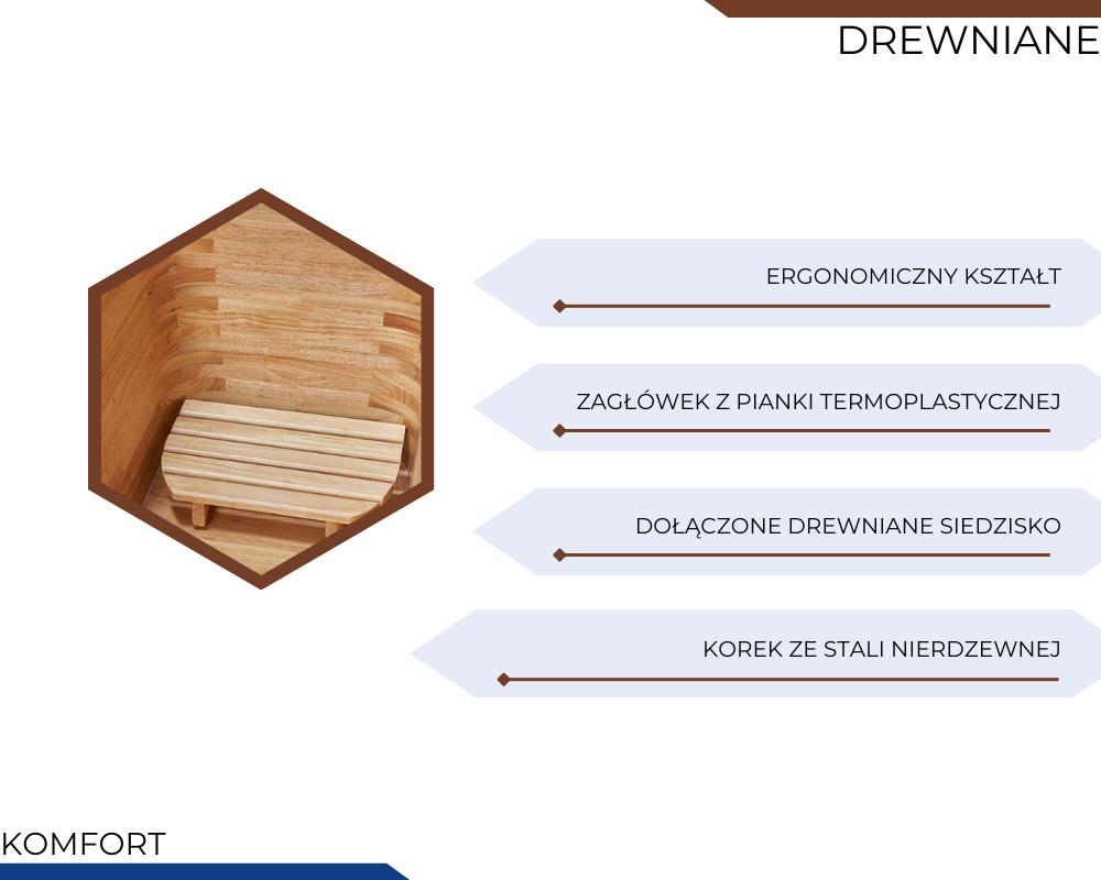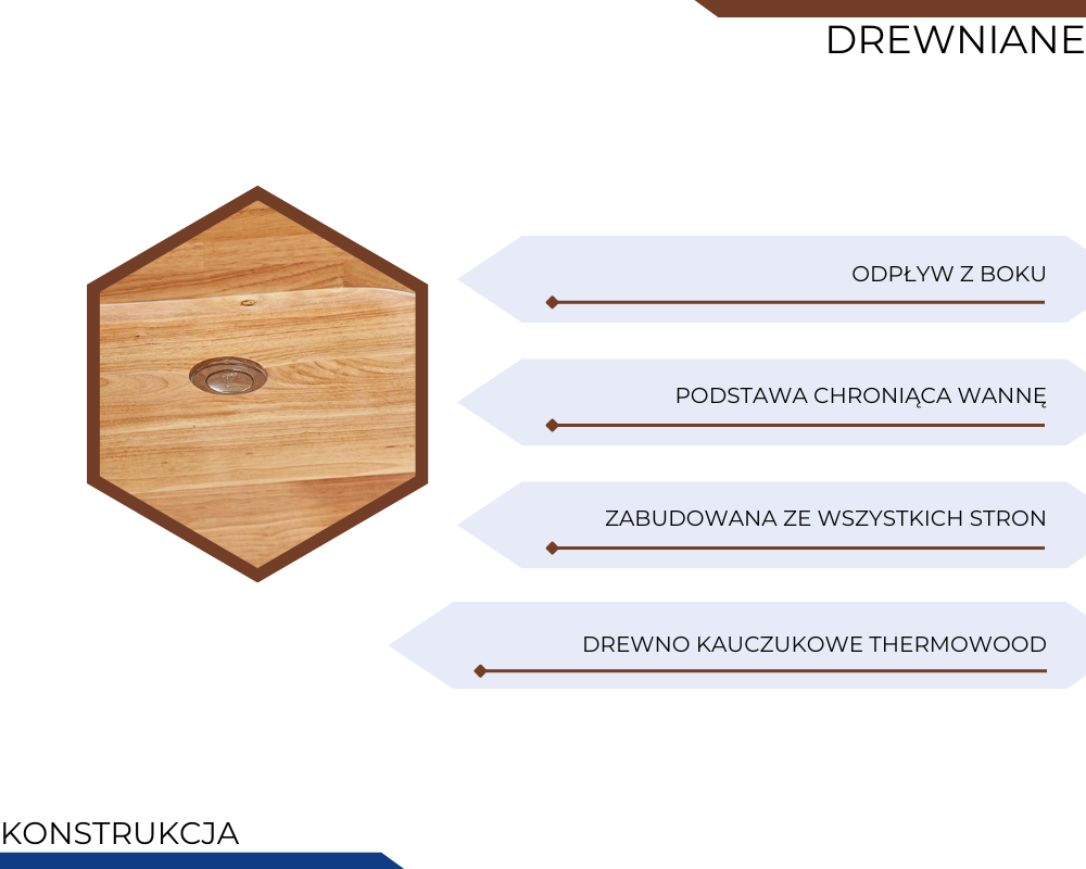 Wnętrze wyposażone jest w ergonomiczne drewniane siedzisko oraz wygodną poduszkę pod kark wykonaną z antypoślizgowej skóry syntetycznej. Na spodzie znajduje się okrągły odpływ ze stali nierdzewnej – trwały, łatwy do czyszczenia i estetyczny.