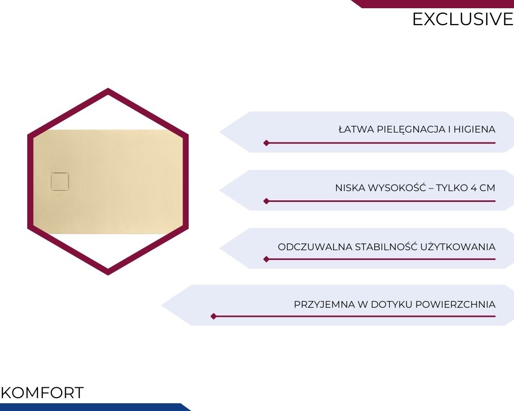 W przeciwieństwie do popularnych brodzików typu SMC, które są lekkimi formami z tworzywa o strukturze kamienia, ten model wykonany jest z rzeczywistego kompozytu kamiennego. Konstrukcja brodzika jest pełna, bez pustych przestrzeni pod powierzchnią użytkową. Całość została wypełniona masą kamienną, co przekłada się na wyjątkową stabilność, wysoką nośność i brak uginania się podczas użytkowania.