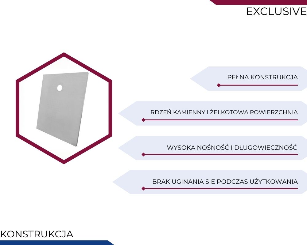 W przeciwieństwie do popularnych brodzików typu SMC, które są lekkimi formami z tworzywa o strukturze kamienia, ten model wykonany jest z rzeczywistego kompozytu kamiennego. Konstrukcja brodzika jest pełna, bez pustych przestrzeni pod powierzchnią użytkową. Całość została wypełniona masą kamienną, co przekłada się na wyjątkową stabilność, wysoką nośność i brak uginania się podczas użytkowania.