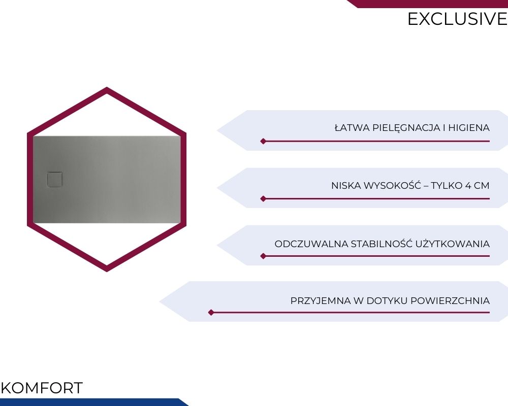 W przeciwieństwie do popularnych brodzików typu SMC, które są lekkimi formami z tworzywa o strukturze kamienia, ten model wykonany jest z rzeczywistego kompozytu kamiennego. Konstrukcja brodzika jest pełna, bez pustych przestrzeni pod powierzchnią użytkową. Całość została wypełniona masą kamienną, co przekłada się na wyjątkową stabilność, wysoką nośność i brak uginania się podczas użytkowania.