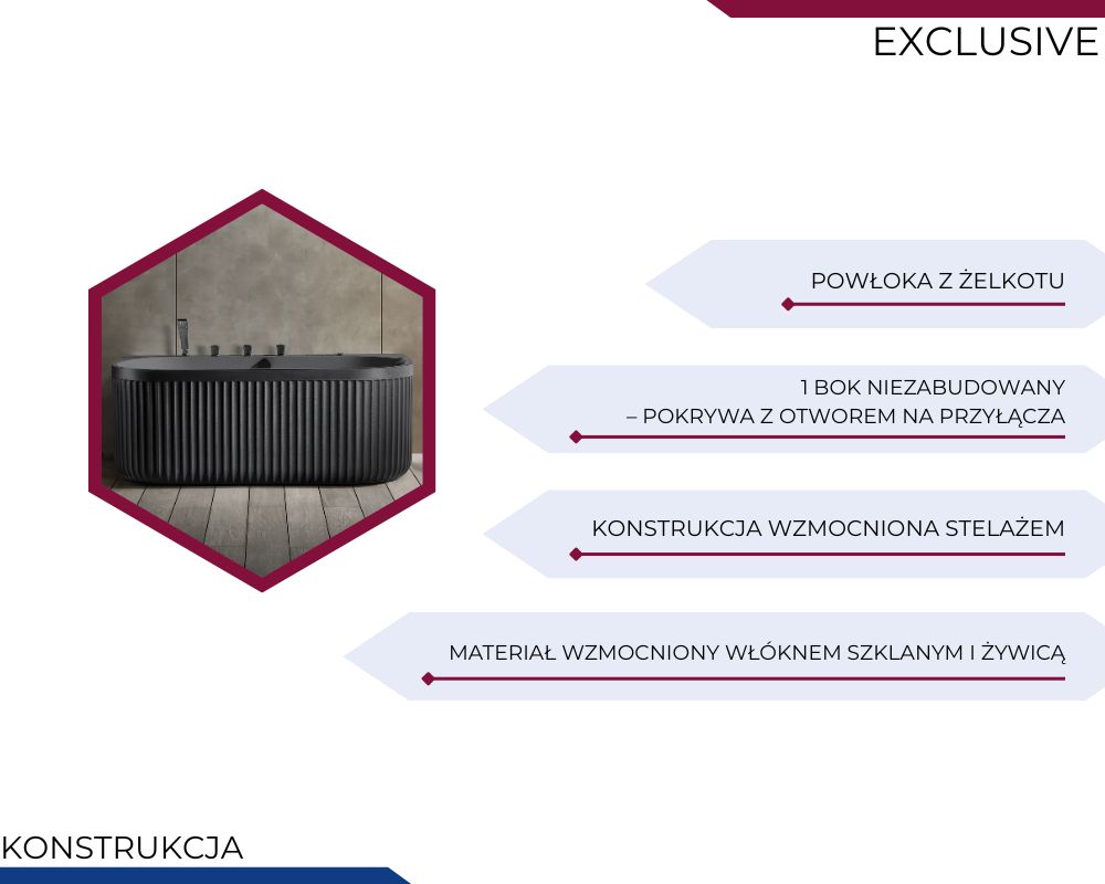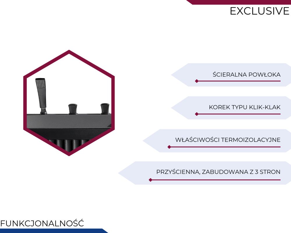 Wanna zabudowana z 3 stron (1 bok niezabudowany – pokrywa z otworem na przyłącza)