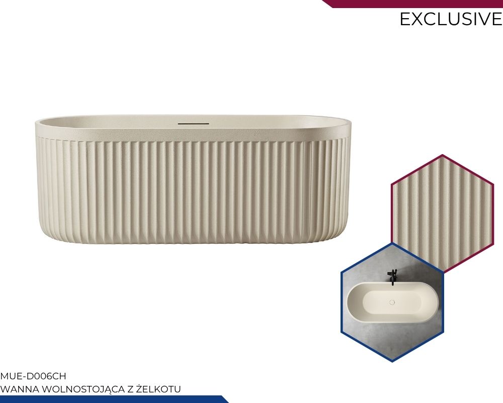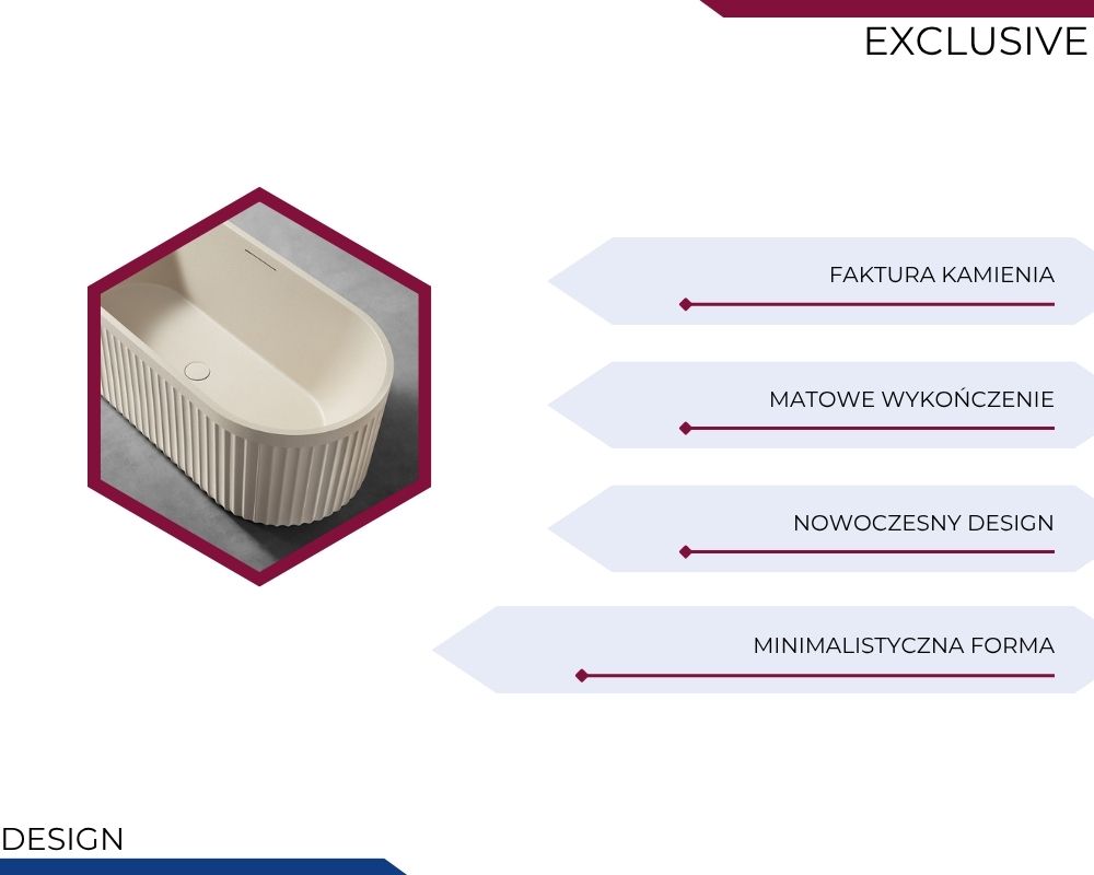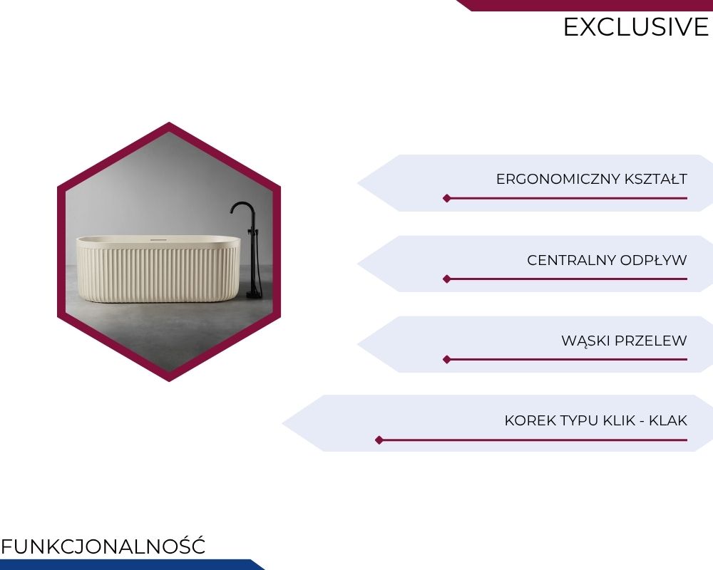Wanny z tej kolekcji to wyjątkowe modele wolnostojące, należące do prestiżowej serii EXCLUSIVE. Wykonane z wysokiej jakości materiałów i dopracowane w każdym detalu, zapewniają komfort oraz funkcjonalność na najwyższym poziomie. Nowoczesny design z efektownymi ryflowaniami doskonale wpisuje się w aranżacje współczesnych łazienek, stanowiąc ich stylowy akcent. Połączenie elegancji, ergonomii i trwałej, odpornej na zarysowania powłoki podkreśla ich luksusowy charakter.