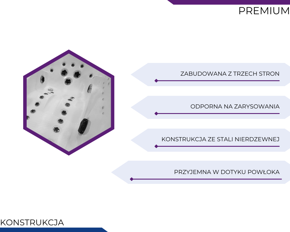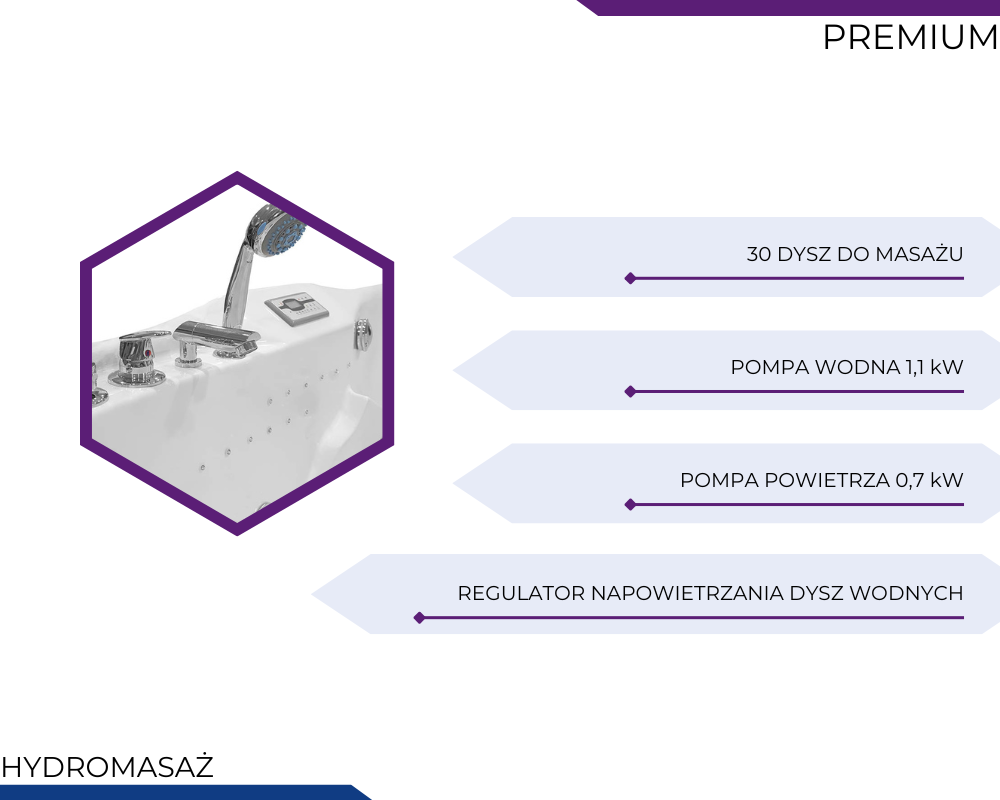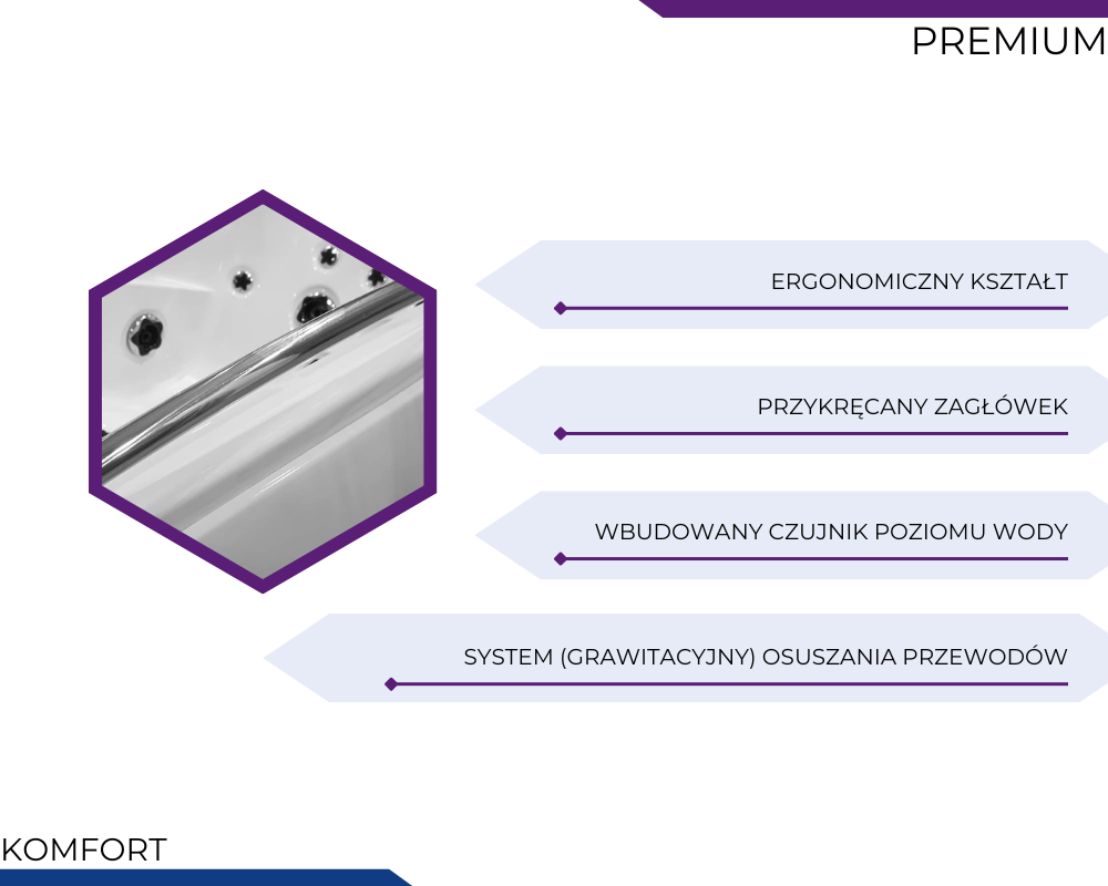 Wanny z hydromasażem PREMIUM to propozycja dla osób, które pragną połączyć luksus, technologię i wyjątkowy komfort w jednym rozwiązaniu. Każdy element – od solidnej konstrukcji ze stali nierdzewnej, przez zaawansowane systemy masażu, po nastrojowe oświetlenie i funkcje audio – został zaprojektowany z myślą o maksymalnym relaksie i długotrwałej satysfakcji z użytkowania. To wybór, który podnosi standard codziennej kąpieli, zamieniając ją w prawdziwy rytuał odprężenia i regeneracji. Wanny PREMIUM to inwestycja w jakość, estetykę i komfort, które każdego dnia wprowadzają do łazienki atmosferę domowego spa.