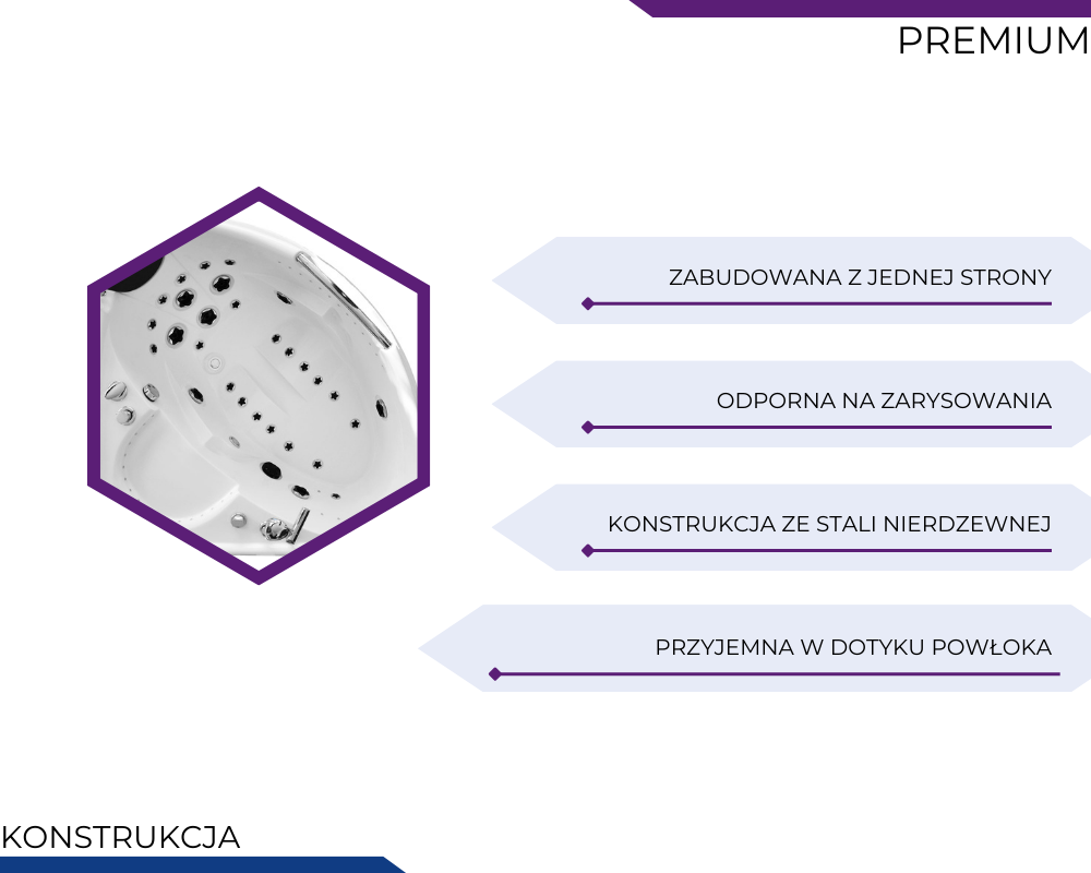 Wanny z hydromasażem PREMIUM to propozycja dla osób, które pragną połączyć luksus, technologię i wyjątkowy komfort w jednym rozwiązaniu. Każdy element – od solidnej konstrukcji ze stali nierdzewnej, przez zaawansowane systemy masażu, po nastrojowe oświetlenie i funkcje audio – został zaprojektowany z myślą o maksymalnym relaksie i długotrwałej satysfakcji z użytkowania. To wybór, który podnosi standard codziennej kąpieli, zamieniając ją w prawdziwy rytuał odprężenia i regeneracji. Wanny PREMIUM to inwestycja w jakość, estetykę i komfort, które każdego dnia wprowadzają do łazienki atmosferę domowego spa.