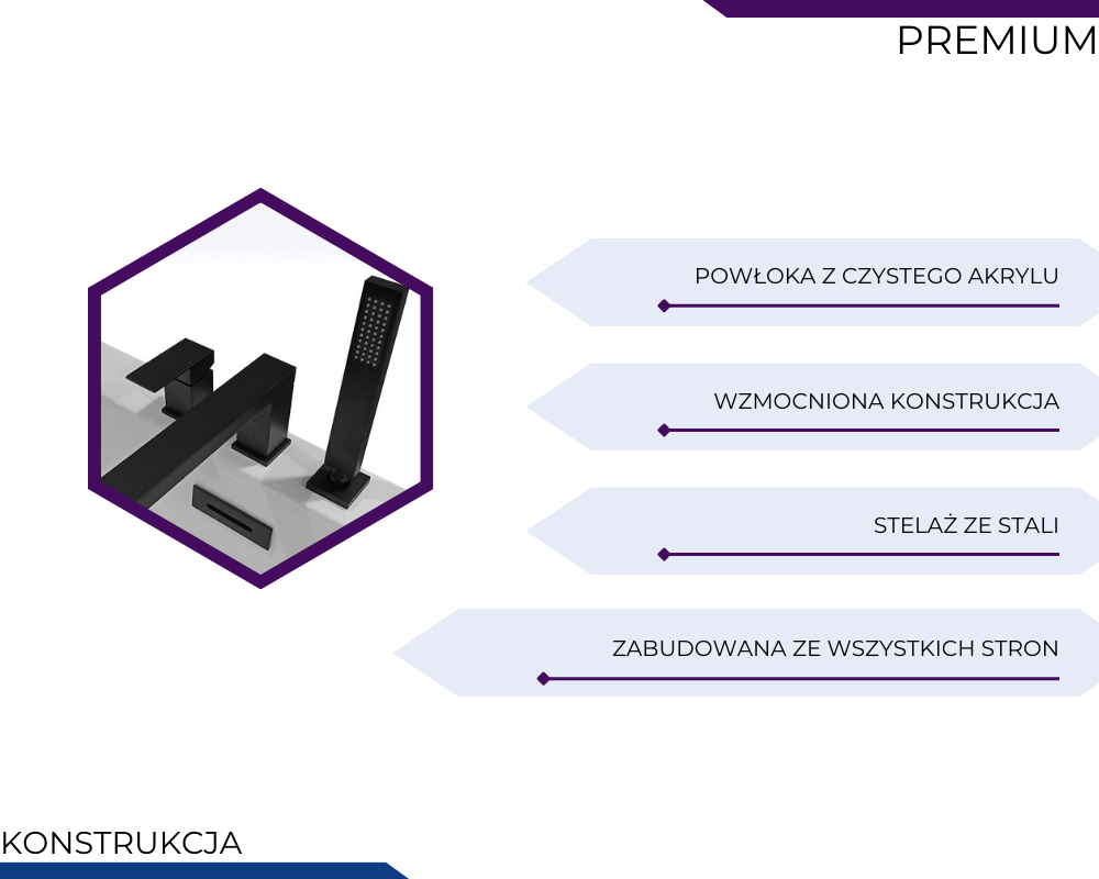 Czysty akryl oferuje nie tylko trwałość, ale również wyjątkowe wrażenia przy dotyku – jego powierzchnia jest ciepła, delikatna i przyjemna dla skóry. Wrażenie miękkiej w dotyku faktury akrylu potęguje doznania relaksacyjne, tworząc idealne warunki do odprężenia ciała i ukojenia zmysłów po intensywnym dniu.