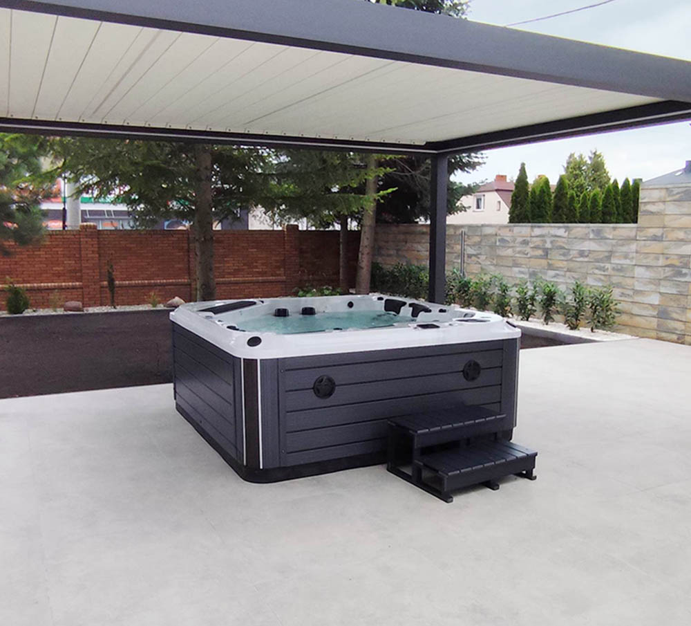 Przedstawiamy realizację, która w wyjątkowy sposób łączy nowoczesną technologię z elegancką, dopracowaną w detalach przestrzenią ogrodową. Model MOG-1513 w stonowanej kolorystyce i z efektownym podświetleniem LED idealnie wpisuje się w minimalistyczną aranżację pod zadaszoną strefą wypoczynkową. Harmonijne zestawienie jasnej niecki z szarą obudową podkreśla prestiżowy charakter całej inwestycji.